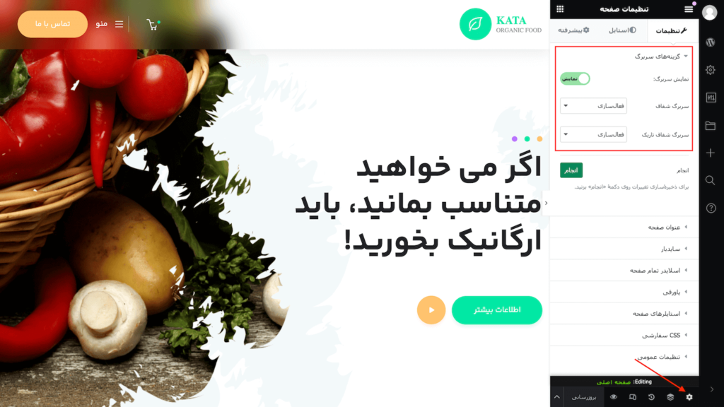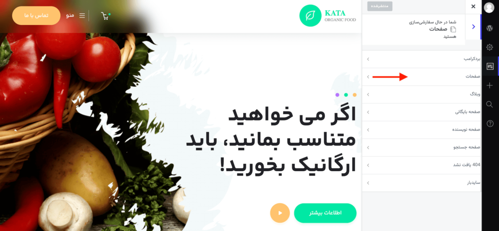 ۱- از پیشخوان وردپرس خود به کاتا > تنظیمات (یا نمایش > سفارشی سازی) بروید و گزینه صفحات را انتخاب کنید.